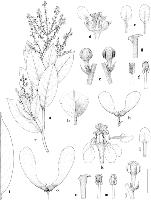 i–o, H. mathewsana. i. Leaf, abaxial view. j. Flower bud. k. Flower, lateral view with posterior petal to right. l. Posterior petal, abaxial view. m. Anthers, abaxial view (left) and adaxial view (right). n. Distal portion of style. o. Fruit with two samaras developed.