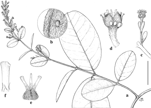 Heteropterys maguirei. a. Flowering branch. b. Enlargement of abaxial leaf margin showing hairs and gland. c. Old flower showing bract, peduncle, bracteoles, and pedicel. d. Old flower showing calyx glands and revolute sepals. e. Gynoecium. f. Distal portion of style. Scale bar equivalents: a, 4 cm; b, 0.8 mm; c, 1 cm; d, 4 mm; e, 2.7 mm; f, 1 mm.—Based on Croat 54310, MICH. Drawn by Karin Douthit. First published in Mem. New York Bot. Gard. 64: 226. 1990; reproduced with permission of the author.