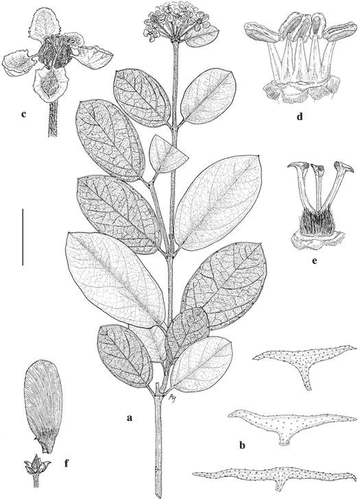 Scale bar equivalents: a, 3 cm; b, 0.15 mm; c, 7.4 mm; d, e, 2.3 mm; f, 1.5 cm.—Based on Steyermark 105119, MICH. Drawn by Annette Seidenschnur Mahler. First published in Mem. New York Bot. Gard. 32: 179. 1981; reproduced with permission of the author.