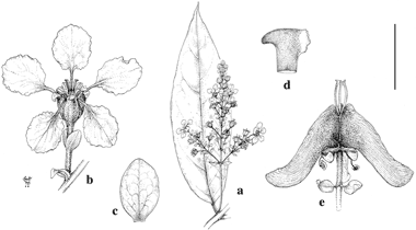 Heteropterys subhelicina. a. Leaf and axillary inflorescence. b. Flower, posterior petal uppermost. c. Bracteole. d. Distal portion of style. e. Immature fruit. Scale bar equivalents: a, 4 cm; b, 7 mm; c, 2.7 mm; d, 0.8 mm; e, 8 mm.—Based on Pires et al. 14340, MICH. Drawn by Karin Douthit. First published in Mem. New York Bot. Gard. 32: 194. 1981, as H. catoptera; reproduced with permission of the author.