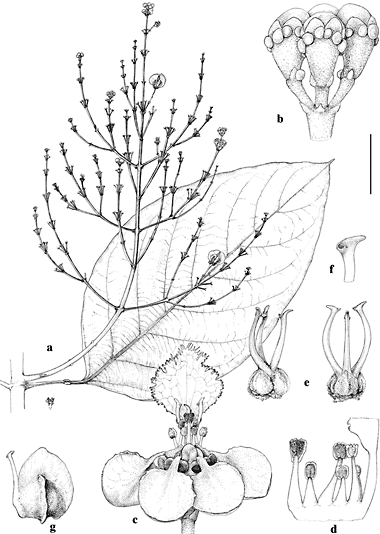 Adelphia mirabilis. a. Inflorescence and leaf. b. Umbel of four flower buds, with two bracteoles showing the single eccentric gland. c. Flower, posterior petal uppermost. d. Portion of androecium laid out, abaxial view, with base of posterior petal for orientation, the stamen to left opposite anterior sepal. e. Gynoecia, side view with anterior style to right (left), front view with anterior style in center. f. Apex of style. g. Samara.
