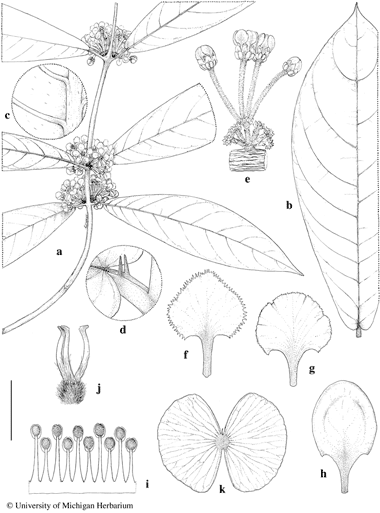 Hiraea affinis. a. Flowering branch. b. Large leaf, adaxial view. c. Detail of abaxial leaf surface, showing very sparse appressed pubescence. d. Petiole with a pair of stipules and base of lamina. e. Inflorescence. f. Posterior petal. g. Posterior-lateral petal. h. Anterior-lateral petal. i. Androecium laid out, abaxial view, the stamen second from left opposite posterior petal. j. Gynoecium, anterior style at right. k. Samara, abaxial view (dorsal wing absent). Scale bar equivalents: a, b, 4 cm; c, 4 mm; d, 8 mm; e, 1.3 cm; f–j, 4 mm; k, 2.7 cm. Based on: a, f–j, Maas et al. 7417, NY; b, Oldeman B-2995, MICH; c, d, Granville B-4662, P; e, Sandwith 1185, K; k, Lanjouw 989, P. Drawn by Karin Douthit. © University of Michigan Herbarium.