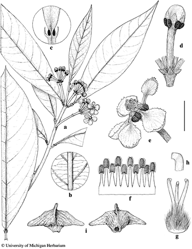 Hiraea brachyptera. a. Flowering branch and adaxial view of detached large leaf. b. Enlargement of abaxial surface of lamina to show parallel cross-veins. c. Stipules and glands at apex of petiole, adaxial view. d. Flower bud in umbel. e. Flower, lateral view, posterior petal at upper right. f. Androecium laid out, abaxial view, fifth stamen from left opposite posterior petal. g. Gynoecium, anterior style in center. h. Apex of lateral style. i. Mericarps, abaxial view (left) and view from below (right). Scale bar equivalents: a, 4 cm; b, 1.3 cm; c–e, 8 mm; f, 4 mm; g, 2.7 mm; h, 1 mm; i, 1.3 cm. Based on: a–h, Cuatrecasas 15935, US; i, Fuchs et al. 22153, U. First published in Novon 32: 68. 2024; reproduced with permission of the author.