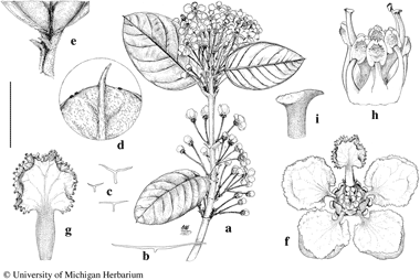 Hiraea bullata. a. Flowering branch. b. Hair from abaxial leaf vein. c. Hairs from abaxial leaf surface. d. Apex of lamina, abaxial view. e. Petiole bearing stipules. f. Flower, posterior petal uppermost. g. Posterior petal, adaxial view. h. Androecium and gynoecium, lateral view with stamen opposite posterior petal to right. i. Apex of a posterior style. Scale bar equivalents: a, 4 cm; b, c, 1 mm; d, 4 mm; e, f, 8 mm; g, 4 mm; h, 3.3 mm; i, 1 mm. Based on Mori 10852, MICH. Drawn by Karin Douthit. © University of Michigan Herbarium.