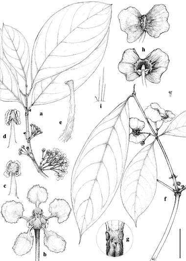 Hiraea. a–f, H. celiana. a. Flowering branch. b. Flower, posterior petal uppermost. c. Stamen, abaxial view. d. Stamen, adaxial view. e. Style. f–i, H. silvae. f. Fruiting branch. g. Stipules and petiolar glands. h. Fruit with only one samara developed, abaxial view (above) and adaxial view (below). i. Hairs from fruit. Scale bar equivalents: a, 4 cm; b, 8 mm; c–e, 2 mm; f, 4 cm; g, 5 mm; h, 2 cm; i, 0.6 mm. Based on: a–e, Maguire & Politi 27965, MICH; f–i, Silva & Brazão 60964, MICH. Drawn by Karin Douthit. First published in Mem. New York Bot. Gard. 32: 248. 1981; reproduced with permission of the author.