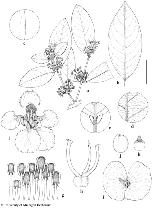 Hiraea fagifolia. a. Flowering branch. b. Large leaf, adaxial view. c. Margin of lamina, adaxial view, with gland. d. Abaxial surface of lamina to show fine parallel crossveins. e. Distal portion of petiole and base of lamina, adaxial view. f. Flower, posterior petal uppermost. g. Androecium laid out, abaxial view, the shortest stamen opposite posterior petal. h. Gynoecium, anterior style at left. i. Samara, abaxial view. j. Embryo. k. Cutaway view of embryo to show rudimentary second cotyledon hidden between radicle and large cotyledon.