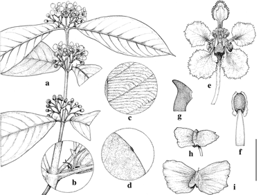 Hiraea faginea. a. Flowering branch. b. Enlargement of node to show epipetiolar stipules. c. Enlargement of abaxial surface of lamina to show parallel cross-veins. d. Enlargement of margin of lamina, near apex, adaxial side, to show marginal gland. e. Flower, posterior petal uppermost. f. Stamen, abaxial view. g. Apex of style. h, i. Samaras, abaxial view. Scale bar equivalents: a, 4 cm; b, c, 1.3 cm; d, 2 mm; e, 8 mm; f, 2 mm; g, 1 mm; h, i, 1.6 cm. Based on: a–g, Level L-20, MICH; h, Forest Dept. 7716, MICH; i, Steyermark 87779, MICH. Drawn by Karin Douthit. Modified from a drawing first published in Fl. Lesser Antilles 4: 615. 1988; reproduced with permission of the author.