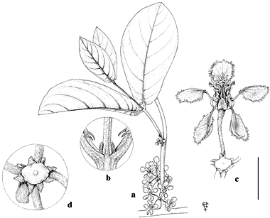 Hiraea fimbriata. a. Flowering branch. b. Node with epipetiolar stipules. c. Flower, posterior petal uppermost. d. Glandular cushion in center of umbel. Scale bar equivalents: a, 4 cm; b, 6.7 mm; c, 8 mm; d, 4 mm. Based on Wurdack & Monachino 39770, MICH. Drawn by Karin Douthit. First published in Mem. New York Bot. Gard. 32: 241. 1981; reproduced with permission of the author.