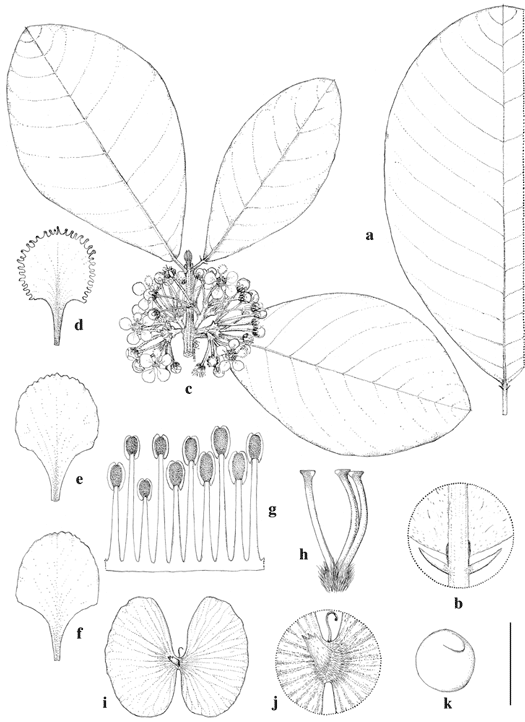Scale bar equivalents: a, 4 cm; b, 8 mm; c, 4 cm; d–f, 5.7 mm; g, h, 2.7 mm; i, 2.7 cm; j, 8 mm; k, 5.7 mm. Based on: a, b, d–h, Brandbyge et al. 33565, MICH; c, Burnham 1830, MICH; i–k, Burnham 1737, MICH. Drawn by Karin Douthit. © University of Michigan Herbarium.