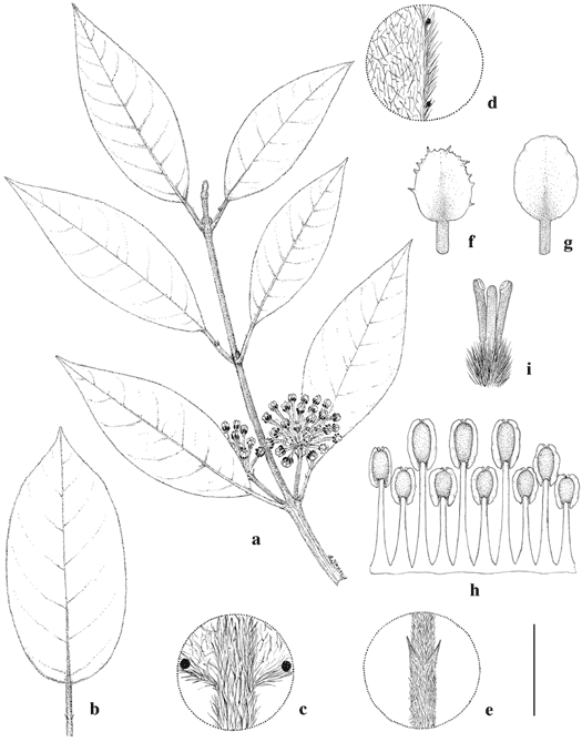 Scale bar equivalents: a, b, 4 cm; c, d, 4 mm; e, 8 mm; f, g, 4 mm; h, i, 2.7 mm. Based on: a, Valenzuela et al. 11778, MICH; b–e, Smith et al. 871A, MO; f–i, Perea et al. 1637, MICH. Drawn by Karin Douthit. First published in Edinburgh J. Bot. 70: 429. 2013; reproduced with permission of the author.