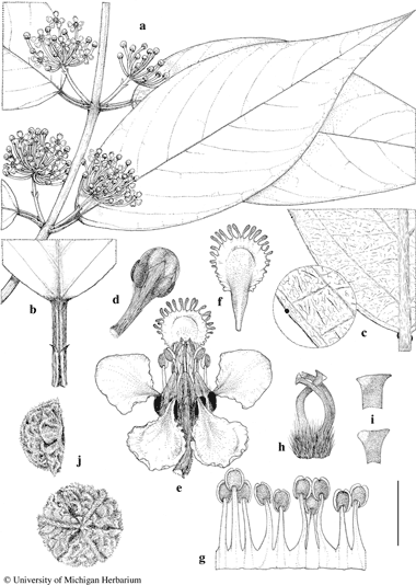 Hiraea quapara. a. Flowering branch. b. Petiole with stipules and base of lamina, adaxial view. c. Base of lamina, abaxial view, with enlargement of margin to show small marginal gland. d. Flower bud, with eglandular sepal in center. e. Flower, posterior petal uppermost. f. Posterior petal, adaxial view. g. Androecium laid out, abaxial view, the shortest stamen opposite posterior petal. h. Gynoecium, anterior style to left. i. Distal portions of styles, anterior style above, posterior style below. j. Intact fruit from above (below) and lateral view of one mericarp (left). Scale bar equivalents: a, 4 cm; b, 1.3 cm; c, 8 mm (4 mm); d, 5.7 mm; e, f, 4 mm; g, h, 2.7 mm; i, 1 mm; j, 1 cm. Based on: a, b, d–i, Martin s.n., MICH; c, Wachenheim s.n., P; j, Sastre 4692, MICH. Drawn by Karin Douthit. First published in Edinburgh J. Bot. 76 [online] 2019; reproduced with permission of the author.