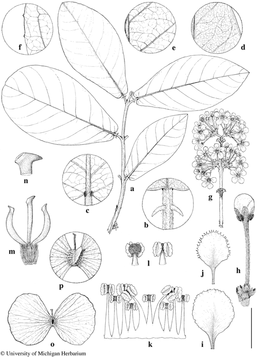 Scale bar equivalents: a, 4 cm; b–e, 8 mm; f, 4 mm; g, 4 cm; h, 8 mm; i, j, 2 cm; k, 2.7 mm; l, 2 mm; m, 2.7 mm; n, 1.3 mm; o, 1.6 cm; p, 8 mm. Based on: a–n, H. H. Smith 1508 p.p. [collected in March], MICH; o, p, H. H. Smith 1508 p.p. [collected in June], NY. Drawn by Karin Douthit. First published in Blumea 61: 134. 2016; reproduced with permission of the author.