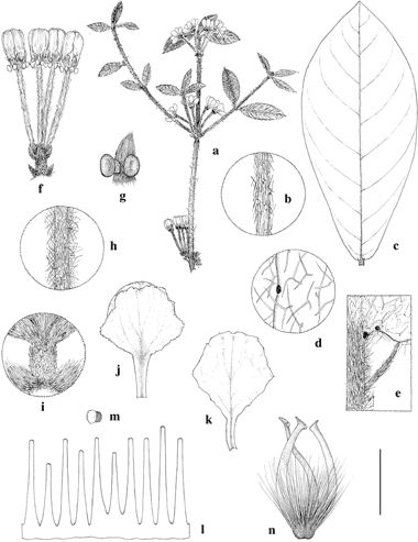 Hiraea singularis. a. Habit. b. Detail of stem showing pubescence. c. Large leaf, adaxial view. d. Detail of abaxial leaf surface, showing pubescence and marginal gland. e. Detail of leaf base, abaxial view, showing two basal glands, and portion of petiole with one stipule. f. Inflorescence. g. Sepal, abaxial view, showing stalked glands. h. Detail of pedicel showing pubescence. i. Detail of inflorescence attachment, showing abbreviated stalk supporting the single umbel. j. Posterior petal, adaxial view. k. Anterior lateral petal, abaxial view. l. Androecium, the anthers detached, filament fourth from left opposite posterior petal. m. Anther. n. Gynoecium, anterior style to left. Scale bar equivalents: a, 4 cm; b, 4 mm; c, 4 cm; d, 2 mm; e, 4 mm; f, 1.3 cm; g–k, 4 mm; l–n, 2.7 mm. Based on: a, b, f–n, Martínez 35, MICH; c–e, Wingfield 7826, MICH. Drawn by Karin Douthit. First published in New York Bot. Gard. 108: 216. 2013; reproduced with permission of the author.