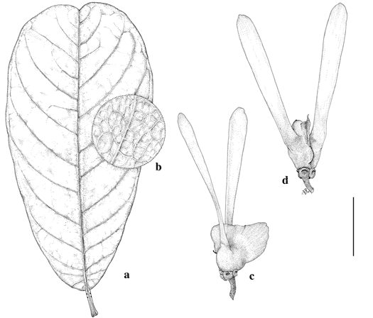 Lophopterys surinamensis. a. Leaf, adaxial view. b. Enlargement of adaxial leaf surface to show reticulum. c. Fruit with only one samara developed, lateral view. d. Fruit with only one samara developed, abaxial view. Scale bar equivalents: a, 4 cm; b, 4 mm; c, d, 2.5 cm. Based on Stahel 223, U. Drawn by Karin Douthit. First published in Contr. Univ. Michigan Herb. 23: 104. 2001; reproduced with permission of the authors.