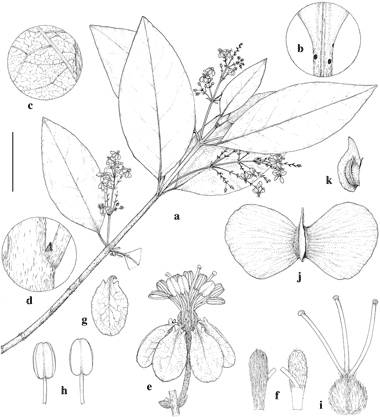Psychopterys polycarpa. a. Flowering branch. b. Apex of petiole, adaxial view, to show glands. c. Enlargement of abaxial surface of lamina. d. Base of petiole, to show stipule. e. Flower. f. Sepals with attached filaments, abaxial view (left) and adaxial view (right). g. Petal, adaxial view. h. Anthers, adaxial view (left) and abaxial view (right). i. Gynoecium. j. Samara, abaxial view. k. Nut of samara with lateral wings cut away, lateral view to show dorsal wing. Scale bar equivalents: a, 4 cm; b–e, 4 mm; f, 2 mm; g, 4 mm; h, i, 2 mm; j, k, 1.3 cm. Based on: a–d, Ventura A. 3035, MICH; e–i, Ventura A. 7345, MICH; j, k, Martínez S. 3846, MICH. Drawn by Karin Douthit. First published in Contr. Univ. Michigan Herb. 25: 129. 2007; reproduced with permission of the authors.