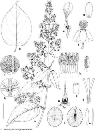 Aspidopterys wallichii. a. Flowering branch. b. Node with interpetiolar stipules. c. Base of lamina, abaxial view. d. Detached large leaf, adaxial view. e. Flower bud with pedicel and peduncle, subtended by bract and bracteoles. f. Flower, lateral view. g. Detached petal. h. Androecium laid out, abaxial view, the stamens with longer filaments opposite sepals. i. Anther, adaxial view. j. Gynoecium. k. Distal portion of style. l. Samaras, abaxial view (left) and adaxial view (right). m. Embryos. n. Old flower after fall of samaras, showing torus subtended by lobed glandular disc. Scale bar equivalents: a, 4 cm; b, 8 mm; c, 4 mm; d, 4 cm; e–g, 4 mm; h, 2 mm; i, 1.5 mm; j, 2 mm; k, 0.7 mm; l, 2 cm; m, 8 mm; n, 4 mm. Based on: a–c, e–k, Kaul s.n., MO; d, Singh 387, NY; l–n, Raizada s.n., NY. Drawn by Karin Douthit. © University of Michigan Herbarium.