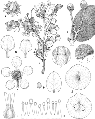 Calcicola parvifolia. a. Flowering branch. b. Leaves to show range in size, adaxial view (left) and abaxial view (right). c. Node with interpetiolar stipules. d. Edge of lamina with marginal gland, abaxial view except where turned to show adaxial vesture. e. Node and leaf (adaxial view) with axillary inflorescence. f. Flower, posterior petal uppermost. g. Posterior petal (left) and lateral petal (right), adaxial views. h. Androecium laid out, abaxial view, shortest stamen opposite posterior petal. i. Gynoecium, anterior style in center. j. Samaras, adaxial view (above) and abaxial view (below). k. Old flower after fall of samaras, pyramidal torus in center, surrounded by lobed disc.