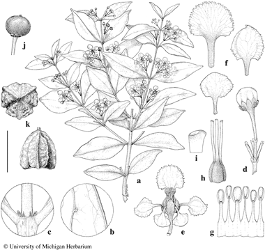 Malpighia glabra. a. Flowering branch. b. Gland on abaxial surface of lamina. c. Node with interpetiolar stipules. d. Flower bud in umbel. e. Flower, posterior petal uppermost. f. Petals, abaxial views, posterior (above), posterior-lateral (right), anterior-lateral (below). g. Portion of androecium laid out, abaxial view, stamen at left opposite posterior petal. h. Gynoecium. i. Apex of style. j. Fresh fruit, drawn from a photo. k. Dried fruit, from above (above left) and from the side (below). Scale bar equivalents: a, 4 cm; b, c, 4 mm; d, e, 8 mm; f, 5 mm; g, h, 2.7 mm; i, 0.7 mm; j, 2 cm; k, 1 cm. Based on: a, c–i, Gentle 151, MICH; b, Whitefoord 10167, MICH; j, Landrum 10415, MICH; k, Calzada 1697, MICH. Drawn by Karin Douthit. © University of Michigan Herbarium.