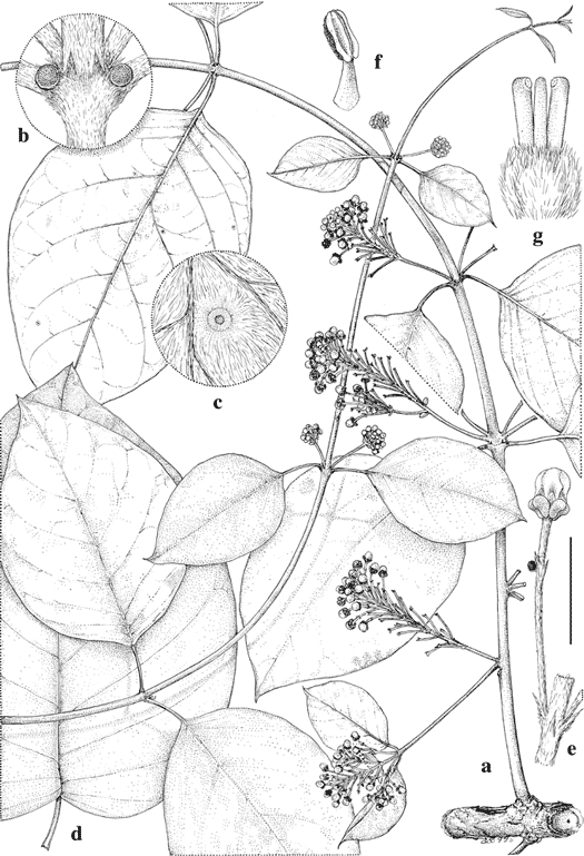 Mascagnia aequatorialis. a. Flowering branch from old stem, crossed by younger stem. b. Node showing stipules and glands at base of petioles. c. Enlargement of abaxial leaf surface showing gland and appressed vesture. d. Detached large leaf. e. Flower bud and portion of inflorescence axis. f. Stamen from flower bud. g. Gynoecium from flower bud.