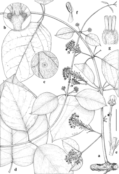 Mascagnia aequatorialis. a. Flowering branch from old stem, crossed by younger stem. b. Node showing stipules and glands at base of petioles. c. Enlargement of abaxial leaf surface showing gland and appressed vesture. d. Detached large leaf. e. Flower bud and portion of inflorescence axis. f. Stamen from flower bud. g. Gynoecium from flower bud. Scale bar equivalents: a, 4 cm; b, 5 mm; c, 4 mm; d, 4 cm; e, 8 mm; f, g, 2.7 mm. Based on CerĂ³n M. & Iguago 5475, MICH. Drawn by Karin Douthit. First published by W. R. Anderson & C. C. Davis in Contr. Univ. Michigan Herb. 24: 36. 2005.