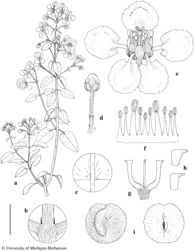 Mascagnia lilacina. a. Flowering branch. b. Node showing interpetiolar stipules. c. Abaxial base of lamina to show glands. d. Flower bud. e. Flower, posterior petal uppermost. f. Androecium laid out, adaxial view, the stamen fifth from left opposite posterior petal. g. Gynoecium, anterior style in center. h. Distal portions of posterior style (above) and anterior style (below). i. Samaras, abaxial view (left), adaxial view (right). Scale bar equivalents: a, 4 cm; b, 2 mm; c, 5.7 mm; d, 8 mm; e, 5.7 mm; f, g, 4 mm; h, 2 mm; i, 2 cm. Based on: a–h, Johnston 8514, GH; i, Johnston 9001, GH. Drawn by Karin Doutht. © University of Michigan Herbarium.