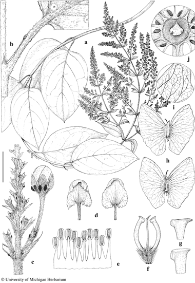 Scale bar equivalents: a, 4 cm; b–e, 4 mm; f, 2.7 mm; g, 1 mm; h, 1.3 cm; i, 5 mm; j, 4 mm. Based on: a–g, García-Barriga 12178, US; h–j, Rusby & Pennell 103, US. Drawn by Karin Douthit. © University of Michigan Herbarium.