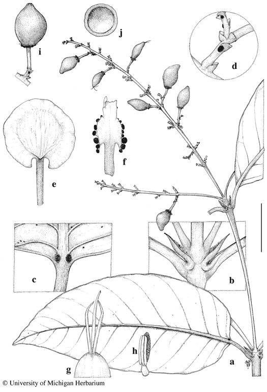 Burdachia sphaerocarpa Adr. Juss. a. Fruiting branch. b. Node to show connate intrapetiolar stipules. c. Abaxial base of lamina to show glands. d. Two-flowered cincinnus. e. Lateral petal, adaxial view. f. Posterior petal, adaxial view. g. Gynoecium. h. Stamen. i. Fruit. j. Fruit in cross-section, seed removed.