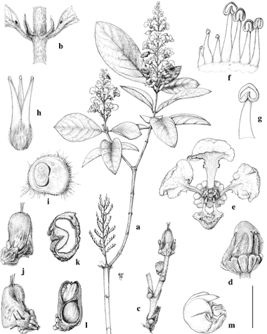 Mcvaughia bahiana. a. Flowering branch. b. Node with stipules and leaf bases. c. Three-flowered cincinnus. d. Flower bud. e. Flower, posterior petal uppermost, the anterior petals bent downward slightly. f. Staminodes and four fertile stamens, adaxial view, the middle staminode opposite posterior petal, stamen at far right opposite anterior sepal. g. Fertile anther, adaxial view. h. Gynoecium. i. Ovary, cross-section. j. Fruit, two views. k. Fruit, cross-section of distal chamber, showing oil tissue around furrow. l. Fruit, cut longitudinally, showing distal chamber with oil tissue and proximal locule (seed removed). m. Embryo. Scale bar equivalents: a, 4 cm; b, 1.3 cm; c, 1cm; d, 4 mm; e, 5.7 mm; f, 2.7 mm; g, h, 2 mm; i, 1 mm; j, 8 mm; k, 4 mm; l, 8 mm; m, 4 mm.—Based on Anderson 11740, MICH. Drawn by Karin Douthit. First published in Taxon 28: 158. 1979; reproduced with permission of the author.