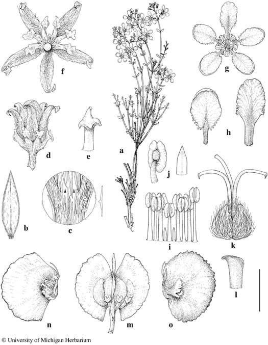Scale bar equivalents: a, 4 cm; b, 1.3 cm; c, 2 mm; d, 4 mm; e, 2 mm; f, 4 mm; g, 8 mm; h, 5 mm; i, 2.7 mm; j, 1.3 mm, 0.4 mm; k, 2 mm; l, 0.6 mm; m–o, 5 mm. Based on: a–l, Simpson 83-10-24-1, MICH; m, n, Simpson 83-10-9-4a, MICH; no Simpson 83-10-23-4, MICH. Drawn by Karin Douthit. © University of Michigan Herbarium.