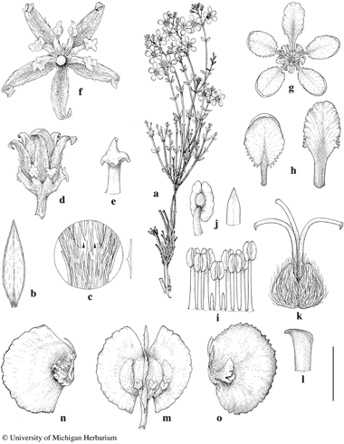 Dinemagonum gayanum. a. Flowering habit. b. Leaf, abaxial view. c. Node with minute interpetiolar stipules (many hairs removed), and detached hair. d. Flower bud. e. Enlarged apex of calyx gland. f. Calyx and glands from below, spread out. g. Flower, posterior petal uppermost. h. Lateral petal (left) and posterior petal (right), adaxial views. i. Androecium laid out, adaxial view, the shortest fertile stamen opposite posterior petal. j. Abaxial view of anther (left) and much-enlarged apex of staminode (right). k. Gynoecium. l. Apex of style. m. Intact fruit with persistent sepals in place. n. Samara with nut rugose on side. o. Samara with lateral winglets on nut. Scale bar equivalents: a, 4 cm; b, 1.3 cm; c, 2 mm; d, 4 mm; e, 2 mm; f, 4 mm; g, 8 mm; h, 5 mm; i, 2.7 mm; j, 1.3 mm, 0.4 mm; k, 2 mm; l, 0.6 mm; m–o, 5 mm. Based on: a–l, Simpson 83-10-24-1, MICH; m, n, Simpson 83-10-9-4a, MICH; no Simpson 83-10-23-4, MICH. Drawn by Karin Douthit. © University of Michigan Herbarium.