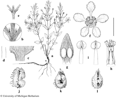 Aspicarpa salicifolia. a. Habit. b. Node with stipules borne on base of petiole (hairs removed to reveal stipules). c. Base of lamina with glands. d. Leaf hairs, from abaxial surface (left) and adaxial surface (right). e. Base of pair of peduncles, with four bracts. f. Chasmogamous flower, posterior petal uppermost. g. Sepal from chasmogamous flower, abaxial view. h. Androecium and gynoecium from chasmogamous flower, the stamen in center opposite anterior sepal. i. Fertile stamen from chasmogamous flower, distal portion, abaxial view (left) and adaxial view (right). j, k, l, cocci from cleistogamous flower, lateral view (j), adaxial view (k), abaxial view (l). Scale bar equivalents: a, 4 cm; b–d, 2 mm; e, 5.7 mm; f, 8 mm; g, 2.7 mm; h, 4 mm; i, 2 mm; j–l, 5 mm. Based on: a–e, Hassler 9129, G; f–h, Hassler 7046, P; j–l, Hatschbach 25228, NY. Drawn by Karin Douthit. © University of Michigan Herbarium.