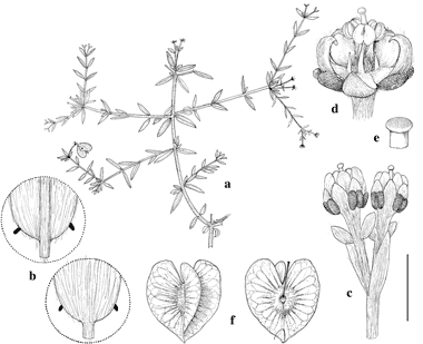 Aspicarpa steinmannii W. R. Anderson. a. Branch with old flowers and young fruit. b. Petiole and base of lamina, abaxial view (above) and adaxial view (below). c. Pair of old flowers with petals shrivelled inward. d. Flower with petals removed, eglandular sepal in front. e. Apex of style. f. Samaras, abaxial view (left) and adaxial view (right). Scale bar equivalents: A, 4 cm; B, 2 mm; C, 4 mm; D, 2.7 mm; E, 1 mm; F, 8 mm. Based on Hernández-Cárdenas 778, MICH. Drawn by Karin Douthit. First published by W. R. Anderson in Acta Botanica Mexicana 109: 25. 2014.