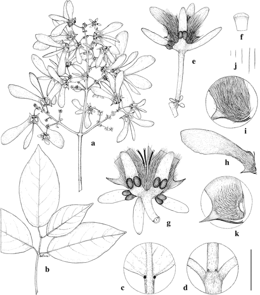 Banisteriopsis rostrata. A. Fruiting branch. B. Leafy branch. C. Base of lamina, abaxial view, showing a pair of basal glands. D. Node, showing a pair of interpetiolar stipules. E. Young developing fruit. F. Nearly mature fruit, with distal portion of dorsal wings removed and eglandular sepal bent downward. G. Distal portion of style. H. Samara. I. Nut of samara, with hairs present and showing carpophore. J. Hairs from nut of samara. K. Nut of samara, with hairs removed and showing carpophore. Scale bar equivalents: A, B, 4 cm; C, 8 mm; D, 4 mm; E, 8 mm; F, 0.5 mm; G, 8 mm; H, 2 cm; I, 6.7 mm; J, 4 mm; K, 6.7 mm. Based on Gentry et al. 59106 (MICH). Drawn by Karin Douthit. First published in Edinb. J. Bot. 77: 493. 2020; reproduced with permission of the author.