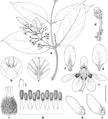 Bronwenia acapulcensis var. acapulcensis. a. Branch with flowers and fruits. b. Node with interpetiolar stipules. c. Base of lamina, abaxial view. d. Flower bud and portion of inflorescence axis. e. Flower, posterior petal uppermost. f. Posterior petal, abaxial view. g. Lateral petal, abaxial view. h. Androecium laid out, abaxial view, stamen above letter "h" opposite posterior petal. i. Gynoecium. j. Apex of style. k. Samara with crest on side of nut. l. Samara with winglet on side of nut. Scale bar equivalents: a, 4 cm; b, 4 mm; c, d, 8 mm; e, 5.7 mm; f, g, 4 mm; h, i, 2 mm; j, 1 mm; k, l, 2 cm. Based on: a, e–k, Burnham 977, MICH; b–d, Burnham 976, MICH; l, Almeda 3983, MICH. Drawn by Karin Douthit. First published by W. R. Anderson & C. C. Davis in Contr. Univ. Michigan Herb. 25: 142. 2007; reproduced with the authors' permission.
