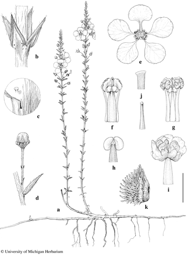 Scale bar equivalents: a, 4 cm; b, 4 mm; c, 0.8 mm; d, 2 cm; e, 1 cm; f, g, 2.7 mm; h, i, 1.3 mm; j, 2 mm; k, 4 mm. Based on: a–j, Anderson 9102, MICH; k, Anderson 11580, MICH. Drawn by Karin Douthit. © University of Michigan Herbarium.
