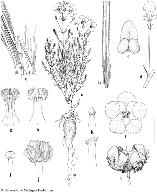 Camarea ericoides. a. Habit. b. Proximal part of leaf, abaxial view, many hairs removed. c. Base of leaf and adjacent stem, showing minute stipule beside leaf, many hairs removed. d. Flower bud. e. Sepal with raised glands, abaxial view. f. Flower, posterior petal uppermost. g. Androecium from front with one fertile stamen flanked by two staminodes. h. Androecium from back with three connate fertile stamens flanked by two staminodes. i. Fertile anther, abaxial view. j. Staminode, abaxial view. k. Stigma from front (above) and from side (below). l. Fruit with two mericarps developed.