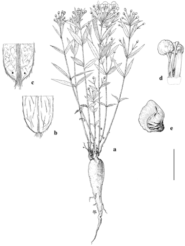 Camarea sericea. a. Habit. b. Base of leaf, adaxial view. c. Base of leaf, abaxial view. d. Androecium and gynoecium, side view, the three stamens to right opposite posterior petal and adjacent sepals. e. Mericarp, side view. Scale bar equivalents: a, 4 cm; b, c, 8 mm; d, e, 4 mm. Based on: a–d, Pohl 1987, W; e, Glaziou 20747, BR. Drawn by Karin Douthit. First published by W. R. Anderson in Contr. Univ. Michigan Herb. 19: 366. 1993.