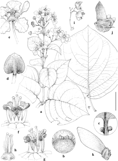 Scale bar equivalents: a, 4 cm; b, c, 4 mm; d, 8 mm; e, 1.3 cm; f–h, 4 mm; i, 4 cm; j, 1.3 cm; k, 2 cm. Based on: a–j, Anderson et al. 36981, MICH; k, Harley 21676, MICH. Drawn by Karin Douthit. Modified from a drawing first published by W. R. Anderson in Contr. Univ. Michigan Herb. 11: 52. 1975.
