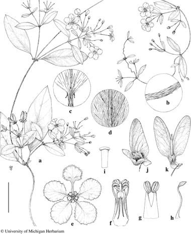Scale bar equivalents: a, 4 cm; b–d, 4 mm; e, 1.3 cm; f–h, 4 mm; i, 1.3 mm; j, k, 8 mm. Based on Anderson 13097, MICH. Drawn by Karin Douthit. © University of Michigan Herbarium.