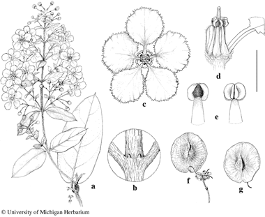 Gaudichaudia cycloptera. a. Flowering branch. b. Node with interpetiolar stipules. c. Flower, posterior petal uppermost. d. Androecium and gynoecium, anterior sepal to left, posterior petal to right. e. Anthers, abaxial view (left) and adaxial view (right). f. Samara, adaxial view, still attached to receptacle by carpophore. g. Samara, abaxial view. Scale bar equivalents: a, 4 cm; b, 8 mm; c, 1 cm; d, 4 mm; e, 2 mm; f, g, 2 cm. Based on: a, c–e, McVaugh 14178, MICH; b, Anderson & Laskowski 4545, MICH; f, g, McVaugh & Koelz 534, MICH. Drawn by Karin Douthit. © University of Michigan Herbarium.