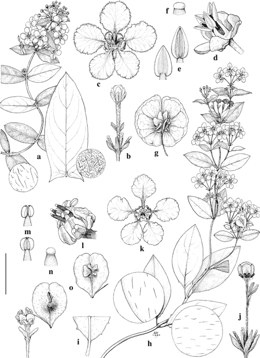 Gaudichaudia mcvaughii and G. chasei. a–g, G. mcvaughii. a. Flowering branch and detached large leaf, with enlargements of adaxial leaf surface (left) and abaxial surface (right). b. Flower bud in umbel. c. Flower, posterior petal uppermost. d. Flower with petals removed, side view. e. Anthers, abaxial view (left) and adaxial view (above). f. Stigma. g. Samara, abaxial view. h–o, G. chasei. h. Flowering branch, with enlargements of adaxial leaf surface (left) and abaxial surface (right). i. Base of leaf. j. Flower bud in umbel. k. Flower, posterior petal uppermost. l. Flower with petals removed, side view. m. Anthers, abaxial view (below) and adaxial view (above). n. Stigma. o. Samaras, adaxial view (left, still attached to receptacle by carpophore) and abaxial view (right). Scale bar equivalents: a, h, 4 cm (4 mm); b, j, 8 mm; c, k, 1 cm; d, l, 4 mm; e, m, 2.7 mm; f, n, 0.7 mm; g, o, 1.3 mm; i, 2 cm. Based on: a–g, Anderson 12699, MICH; h–o, Anderson 12945, MICH. Drawn by Karin Douthit. First published by W. R. Anderson in Contr. Univ. Michigan Herb. 16: 73. 1987.