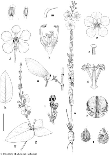 g–n, Janusia caudata. g, Branch of inflorescence. h. Detached leaf, abaxial view. i. Node of inflorescence. j. Flower, posterior petal uppermost. k. Androecium and gynoecium, shortest stamen (in center) opposite posterior petal. l. Anthers, adaxial view. m. Apex of style. n. Samara attached to flower by carpophore. Scale bar equivalents: a, 4 cm; b, 4 mm; c, 1.6 cm; d, 4 mm; e, 1.3 mm; f, 5.7 mm; g, 2 cm; h, 4 cm; i, 6.7 mm; j, 8 mm; k, 4 mm; l, m, 2 mm; n, 8 mm. Based on: a, b, Irwin 13314, MICH; c–e, Anderson 12493, MICH; f, Irwin 10733, MICH; g–i, Sucre & Silva 9235, MICH; j–m, Prance & Silva 58920, MICH; n, Lisboa 74, MICH. Drawn by Karin Douthit. © University of Michigan Herbarium.
