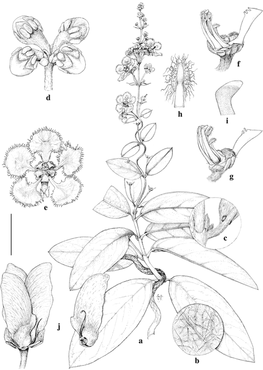 Janusia prancei. a. Flowering branch. b. Abaxial surface of lamina. c. Base of leaf, abaxial view, and node with interpetiolar stipules. d. Umbel of flower buds. e. Flower, posterior petal uppermost. f. Flower, lateral view with sepals cut away and petals removed except claw of posterior petal to right. g. Same as f, but with two lateral stamens in foreground removed to show style. h. Anther, abaxial view. i. Apex of style. j. Immature fruit with sepals cut away (left) and detached anterior samara (right). Scale bar equivalents: a, 4 cm; b, 3.3 mm; c, 1.3 cm; d, 8 mm; e, 1.3 cm; f, g, 8 mm; h, i, 2 mm; j, 8 mm. Based on: a–d, j, Prance 13770, MICH; e–i, Anderson 12334, MICH. Drawn by Karin Douthit. First published by W. R. Anderson in Contr. Univ. Michigan Herb. 16: 88. 1987.