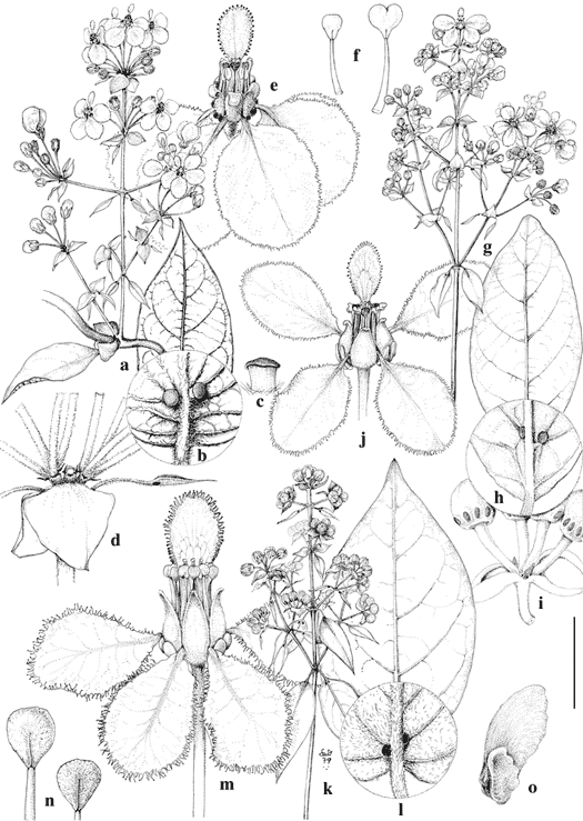 Peixotoa adenopoda, P. sericea, and P. jussieuana. a–f, P. adenopoda. a. Flowering branch and detached stem leaf. b. Base of lamina, abaxial view. c. Leaf gland. d. Base of a distal umbel. e. Flower, posterior petal uppermost. f. Staminodes, adaxial view, posterior-lateral (left) and anterior (right). g–j, P. sericea. g. Flowering branch and detached stem leaf. h. Base of lamina, abaxial view. i. Base of a distal umbel. j. Flower, posterior petal uppermost. k–o, P. jussieuana. k. Flowering branch and detached stem leaf. l. Base of lamina, abaxial view. m. Flower, posterior petal uppermost. n. Staminode glands, adaxial view, anterior (left) and posterior-lateral (right). o. Samara. Scale bar equivalents: a, 4 cm; b, 8 mm; c, 4 mm; d, e, 8 mm; f, 4 mm; g, 4 cm; h–j, 8 mm; k, 4 cm; l, m, 8 mm; n, 2 mm; o, 2 cm. Based on: a–f, Jesus 392, MICH; g–j, Eupunino 120, MICH; k–n, Eiten & Eiten 4835, US; l, Lützelburg 275, M. Drawn by Karin Douthit. First published by C. Anderson in Contr. Univ. Michigan Herb. 15: 81. 1982.