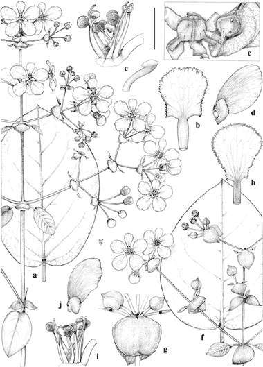 f–j, P. cordistipula. f. Flowering branch and large leaf, abaxial view. g. Base of distal umbel. h. Posterior petal. i. Androecium and gynoecium, with claw of posterior petal. j. Samara.