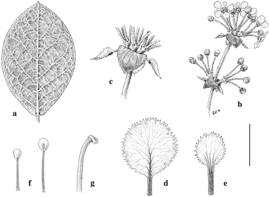 Peixotoa floribunda. a. Stem leaf, abaxial view. b. Flowering branch. c. Base of a distal umbel with a pair of stipules and a pair of inflorescence leaves. d. Lateral petal. e. Posterior petal, the "flag." f. Distal portions of posterior-lateral staminode (left, in abaxial view) and anterior staminode (right, in adaxial view). g. Distal portion of anterior style. Scale bar equivalents: a, 4 cm; b, 1.3 cm; c–e, 6.7 mm; f, 4 mm; g, 2.7 mm. Based on Zardini & Godoy 50346, MICH. Drawn by Amanda Humphrey. First published by C. Anderson in Contr. Univ. Michigan Herb. 23: 50. 2001.