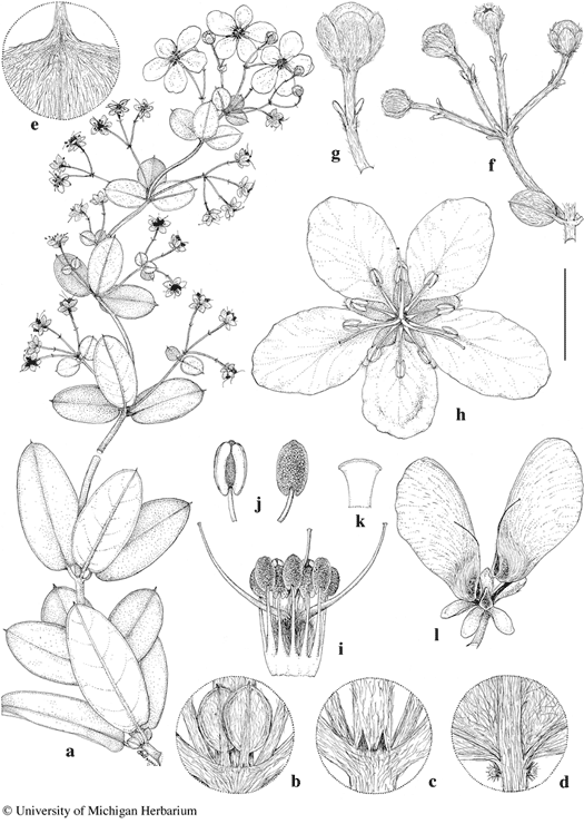 Sphedamnocarpus angolensis. a. Flowering branch. b. Node with leaflike stipules. c. Node with tiny triangular stipules. d. Abaxial base of lamina and apex of petiole with glands. e. Adaxial surface of lamina. f. Umbel of four flower buds. g. Flower bud. h. Flower. i. Androecium and gynoecium. j. Anthers, adaxial view (left) and abaxial view (right). k. Apex of style. l. Fruit with one samara removed and two samaras separating from torus, still attached by carpophores. Scale bar equivalents: a, 4 cm; b, e, 5.7 mm; d, e, 4 mm; f, 1.3 cm; g, h, 8 mm; i, 4 mm; j, 2.7 mm; k, 0.4 mm; l, 6.7 mm. Based on: a–h, Brummitt & Pope 19597, MICH; i–k, Goldblatt & Manning 8835, MICH; l, Long & Rae 603, MO. Drawn by Karin Douthit. © University of Michigan Herbarium.
