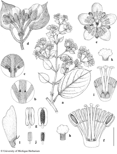Scale bar equivalents: a, 4 cm; b, 4 mm; c, 2.7 mm; d, e, 8 mm; f, 2.7 mm; g, 2 mm; h, 1 mm; i, 2.7 mm; j, 2 mm; k, 1 mm; l, 1.3 cm. Based on: a–d, i–k, Miller et al. 8749, MICH; e–h, Kotozafy 332, MICH; l, Schatz et al. 1699, MO. Drawn by Karin Douthit. © University of Michigan Herbarium.