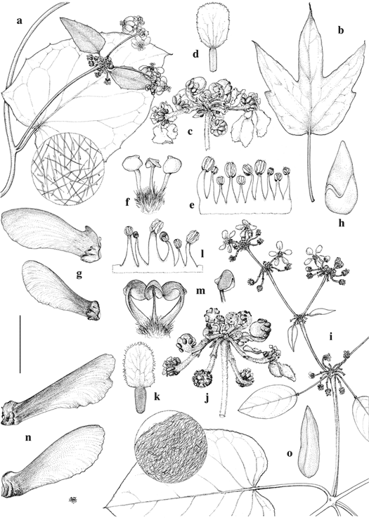 i–o, S. dichotomum. i. Flowering branch and detail of abaxial surface of lamina. j. Umbel. k. Posterior petal. l. Portion of androecium laid flat, adaxial view, posterior stamen on extreme left, anterior stamen on extreme right. m. Gynoecium, anterior style in the center, and lateral view of anterior style. n. Two samaras. o. Embryo.