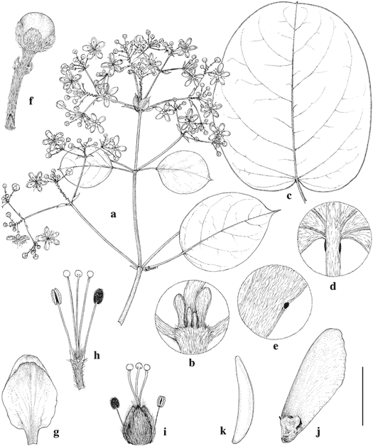 Scale bar equivalents: a, 4 cm; b, 8 mm; c, 4 cm; d, 8 mm; e–i, 4 mm; j, 1.3 cm; k, 4 mm. Based on: a, f–h, Pullen 6658, CANB; b, Pullen 3245, CANB; c–e, Pullen 6613, CANB; i, Frodin & Millar 567, K; j, k, Pullen 6806, CANB. Drawn by Karin Douthit. First published by C. Anderson in Blumea 56: 96. 2011.